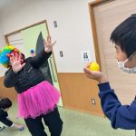 いざ、鬼退治だー!となると、みんな勢いよく豆の代わりのボールを投げつけていました!